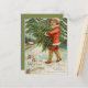 Cette vintage carte de Noël victorienne présente un adorable garçon habillé d'un costume rouge avec garniture en fourrure blanche et naissain d'or, portant un sapin de Noël vert sur une voie enneigée. Le texte dit : "Tous les voeux de Noël" et "Que la joie s'installe à vos côtés, et que toute vie soit juste."
