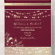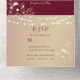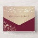 Faire-part de mariage tout-en-un chic aux tons bordeaux et or rose romantiques, dentelle fleurie élégante et lumières clignotantes. Inclut la carte postale RSVP intégrée et le texte personnalisable. Un match parfait pour des mariages de automne rustiques ou des fêtes d'hiver glamour avec une touche de charme boho. Remarque : Cette invitation tout-en-un nécessite une enveloppe distincte pour l'envoi. Nous vous recommandons de l'apparier avec une enveloppe A9 standard (5,75 po x 8,75 po) pour un meilleur ajustement.