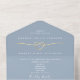 A modern and romantic dusty blue all-in-one wedding invitation featuring a minimalist gold rope heart and a detachable wedding mini-timeline your guests can take with them to the celebration. Designed for couples who want simplicity, elegance, and practical convenience in one stylish piece.