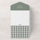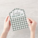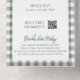 Célébrez avec la mama-to-be et cette mignonne invitation de baby shower vert à damiers simple. Un brun à thème avec un style pique-nique vert sauge à damiers motif et une belle typographie. Inclut une section déchirure avec le code QR du registre et les livres pour la demande de bébé. Parfait pour un baby shower de printemps ou d'été pour un garçon ou une fille. Utilisez comme carte postale en remplissant vos adresses d'expéditeur dans la zone blanche et en ajoutant un timbre. Ou utilisez les enveloppes incluses.