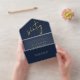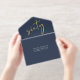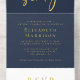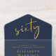 Soirée élégante bleu marine 60e anniversaire tout en une invitation avec "soixante" dans un script chic, votre nom dans la typographie serif classique, les détails de la fête en lettres simples et modernes, et une carte de réponse RSVP déchirante, le tout rendu dans votre choix d'or, argent ou feuille d'or rose.