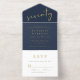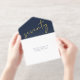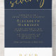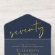 Élégante invitation tout-en-un de 70e anniversaire bleu foncé qui présente "soixante-dix" dans un grand script chic, votre nom dans une élégante typographie serif, les détails de la fête en lettres simples, et une carte de réponse RSVP déchirante blanche, le tout rendu dans votre choix d'or, argent ou feuille d'or rose authentique.