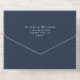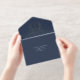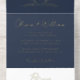 Élégante faire-part de mariage tout-en-un bleu marine foncé avec vos initiales monogrammes à l'intérieur d'une crête de mariage vintage, vos noms, "Réception à suivre" et "Rsvp" présenté dans un script chic, vos détails d'invitation dans la typographie serif classique, et une carte postale de réponse RSVP déchirante blanche, le tout rendu dans votre choix d'or, argent ou rose. Si vous le souhaitez, vous pouvez ajuster la taille du script pour des noms plus longs ou plus courts en modifiant l'outil de conception.