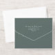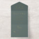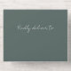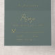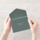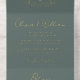 Élégante faire-part de mariage tout-en-un vert sauge qui présente vos initiales monogrammes à l'intérieur d'une crête mariage classique, vos noms, "Réception à suivre" et "Rsvp" présenté dans un script de calligraphie chic, vos détails d'invitation en lettres simples, et une carte postale réponse RSVP déchirante, le tout rendu dans votre choix d'or, argent ou rose feuille d'or. Si vous le souhaitez, vous pouvez ajuster la taille du script pour des noms plus longs ou plus courts en modifiant l'outil de conception.