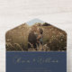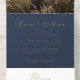 Élégant tout-en-un bleu marine foncé avec votre photo sur le rabat supérieur, vos noms, "Réception à suivre" et "Rsvp" présenté dans un script de calligraphie chic, vos détails d'invitation dans la typographie serif classique, et une carte postale RSVP déchirante blanche, avec tout le texte intérieur rendu dans votre choix d'or, argent ou rose feuille d'or sur arrière - plan noir et blanc .. Si vous le souhaitez, vous pouvez ajuster la taille du script pour des noms plus longs ou plus courts en modifiant l'outil de conception.