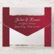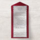 This elegant All In One wedding invitation features a silver pearl center on a ruby, red background, an ornate frame and scroll heart with bride & groom's names in foil. Designed to coordinate with the "Ornate Frame & Hearts" Wedding Collection. To change details, click «Personalize». To move the text or change the text size, font, or color click «Click to customize further»
