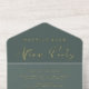 Elégant étage vert sage / faire-part de mariage privé et réception invitation tout en un avec "Happily Ever After Party" dans un mélange de lettrage simple et un script chic, votre faire-part de mariage et d'accueil, et une carte postale RSVP déchirante blanche, le tout rendu dans votre choix d'or authentique, argent ou feuille d'or rose.