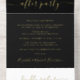 Élégant elopement noir ou mariage privé faire-part et réception décontractée le tout dans une invitation avec "Happily Ever After Party" présenté en lettres simples et un script chic avec des swashes, votre faire-part de mariage et d'accueil invitation, et une carte postale réponse RSVP déchirante, le tout rendu dans votre choix d'or, argent ou feuille d'or rose.