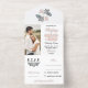 All in one photo wedding invitation in white and rose gold personalized with a photo of the couple and your initials framed by little white flowers on one side. Informal wedding wording in black and rose gold foil text and attached RSVP card.