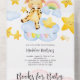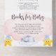 Personnalisez facilement cette adorable invitation de baby shower tout-en-un. Caractéristiques mignonnes de la jungle safari bébés animaux : girafe, éléphant et lion. Ils sont entourés de nuages roses et bleus aquarelles magnifiques, d'étoiles heureuses et d'arcs-en-ciel. Carte de demande de livres pour bébé incluse !