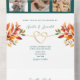 Annoncez votre mariage de automne avec élégance avec cette élégante invitation tout-en-un qui comprend de riches feuilles d'automne turquoises et brûlées, un motif de coeur de corde dorée, et de l'espace pour trois photos personnelles. Inclut des sections RSVP et d'adresse de retour, ainsi qu'une zone de code QR pour faciliter les réponses des invités. Il suffit de plier, sceller et envoyer - aucune enveloppe n'est requise !