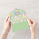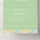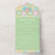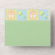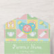 Cette invitation tout-en-un avec carte RSVP amovible présente un arrière - plan de quatre carrés dans des pastels doux de rose, vert, bleu et jaune encadrés par un design blanc comme des points de suture et décorés d'icônes mignonnes sur le thème du bébé d'une bouteille, d'une couche, d'un hochet et d'un bib. Les panneaux verts avec faux couture sont disposés sur le dessus de ce motif de surface composée pour fournir une base pour un exemple de texte à l'intérieur qui peut être customisé pour votre événement et un espace vierge à l'extérieur qui peut être utilisé pour adresser les cartes au destinataire et la section consignée avec l'adresse de retour appropriée. Enfin, une sucette bleue aux accents rose et jaune est posée sur les volets avec un échantillon initial pour ajouter une touche personnalisée finale. N'oubliez pas de consulter la collection complète de courtepointes pour bébés pour obtenir d'autres cadeaux et des produits pour un baby shower ou le petit de votre vie.