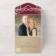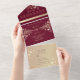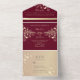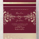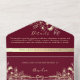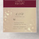 Cette élégante faire-part de mariage tout-en-un présente de riches tons bordeaux, associés à des accents flornaux en or faux rose chatoyants et à un monogramme romantique de coeur de corde. Conçu avec RSVP intégré, un champ de site Web mariage, et un espace pour une photo et une adresse de retour sur le dos, il offre beauté et fonction dans un format écologique. Un choix parfait pour les mariages modernes d'automne ou d'hiver. Remarque : Une enveloppe séparée est nécessaire pour l'envoi par la poste.