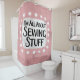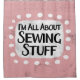 "I'm All About Sewing Stuff" est un design de texte mignon en rose avec du texte en noir, avec une forme d'accent blanc et des points blancs texturés blancs qui l'entourent.