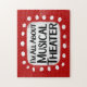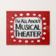 "I'm All About Musical Theater" est un design de texte mignon en rouge avec du texte en noir, avec une forme d'accent blanc et des points blancs texturés blancs qui l'entourent.