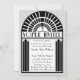 Une invitation à un mariage classique et vintage, en noir et blanc, aux bordures grises. Un graphisme Art Déco stylisé incorporant un coucher de soleil, un cadre et de grands panneaux décorent ce design frappant et une silhouette d'une mariée et de son marié complètent l'image. Toute couleur arrière - plan peut être choisie pour cette conception en sélectionnant l'option "customiser" puis "Modifier", "Arrière - plan". L'art déco était un style populaire dans les années 20, 30 et 40.