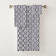 Towel and washcloth with a black and white floral damask pattern. The towel hangs on a rod, displaying elegance, while the washcloth is folded, showing texture.