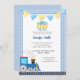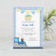 Toy Train Boys Baby shower bleu Invitation pour bébé à être. Customisez avec le nom du bébé et les informations sur la douche. Design possède un train bleu avec de la fumée, des voies ferrées et un arrière - plan à chèques bleus. Invitation de douche parfaite pour bébé garçon.