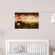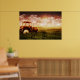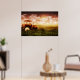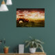 Featuring a breath taking view of a tractor plowing the wheat fields with a orange sun set behind the tractor.on this poster