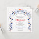 Invitation de Tradition Bar Mitzvah, entourée de la frontière de Jérusalem en or et en bleu avec la phrase si j'oublie Jérusalem, que ma main droite oublie sa ruse en hébreu, אם אשכחך ירושלים תשכח ימיני