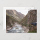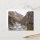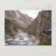 Carte postale du train bleu du chemin de fer Inca qui va de Cusco vers Machu Picchu en passant par la Vallée Sacrée ou la Vallée d'Urubamba avec de grandes montagnes et la rivière Urubamba au Pérou.