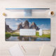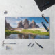 Photo desk mat with the famous three peaks of the Tre Cime di Lavaredo or Drei Zinnen Dolomites mountain with reflection in the water of a puddle on a beautiful day in South Tyrol/Trentino Alto-Adige in Northern Italy.