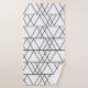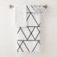 Ce kit de serviettes présente un design moderne du milieu du siècle, composé de triangles blancs superposés et de lignes noires horizontalement.