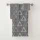Ce kit de serviettes a un design scandinave de triangles séparés en trois endroits avec trois autres imbriqués à l'intérieur dans plusieurs couleurs.