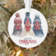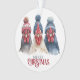 On this cute Holiday ornament, a line of three funny chickens wear patterned knitted blue and pink ski hats. The text at the bottom says "Merry Christmas" on one side, and "Happy New Year" on the other.