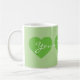 Cette tasse présente trois coeurs vert de printemps sur un arrière - plan vert clair recouvert de texte modèle. Une tasse de coeurs verts rend une grande fête de mariage ou un grand cadeau de la Saint Patrick pour votre garçon ou lassie irlandais!