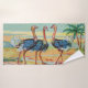 Une très vielle étiquette vintage d'Inde représentant trois autruches réutilisée sur une serviette de bain. Il y a aussi un tapis de bain assorti !
