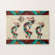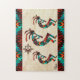 Profitez de ce Puzzle unique du sud-ouest de Kokopelli! Trois Kokopelli Sud-Ouest dansent et jouent de la Flûte sous le soleil sur un Arrière - plan de grès Tan...Entouré d'une frontière Sud-Ouest en Turquoise, Orange et Noir! C'est un Art Design original de l'artiste Kerry Miller.