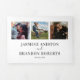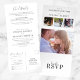 Invitation de mariage triptyque élégante et minimaliste tout-en-un avec un fond blanc, des photos des mariés, les détails de votre mariage, une invitation de mariage et une carte-réponse pour le choix du menu à détacher et renvoyer.