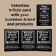 Bonne Saint Valentin ! Un beau jour férié pour célébrer ce mois de février et faire de la publicité pour votre entreprise ou pour promouvoir votre marque. Carte triplée personnalisable noire avec salutation Valentine, votre nom d'entreprise, produits ou services et autres informations de votre entreprise. Tripler la carte comme brochure pour votre entreprise. Vous pouvez mettre jusqu'à trois produits ou services. Customisez-le et donnez-le à vos clients ou clients pour les saluer cette fête de la Saint-Valentin et comme matériel de marketing pour annoncer votre entreprise et pour promouvoir vos produits ou services. Pour customiser cette carte triplée, téléchargez le logo de votre entreprise et des images de vos produits ou services. Tapez également votre nom d'entreprise, votre adresse, votre numéro de téléphone, votre adresse électronique, votre site Web ou votre page de médias sociaux d'affaires et une brève description attrayante de vos produits ou services. Veuillez vérifier l'apparence sur tous les côtés après avoir téléchargé des images et tapé des textes. Si l'apparence vous plaît, vous pouvez passer votre commande maintenant. Si vous avez besoin de redimensionner et déplacer les images et les textes pour s'adapter à cette carte triplée, s'il vous plaît changer dans l'outil de conception. Vous pouvez également modifier la couleur arrière - plan, la couleur de police et le style de police dans l'outil de conception. Annoncez votre entreprise. Faites la promotion de votre marque. Carte triplée personnalisable que vous pouvez utiliser pour développer la sensibilisation de marque. Bonne Saint Valentin ! Je vous souhaite plus de ventes cette saison des Fêtes.