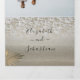 Invitation de mariage triptyque simple, moderne, tropicale, estivale, avec feuilles de palmier dorées, sable, vagues de l'océan, poissons dorés et photo du couple.