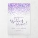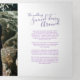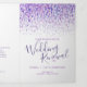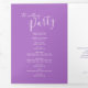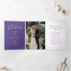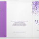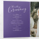 Un programme de renouvellement mariage de six pages d'art moderne violet. Modifiez ce programme de mariage avec vos propres noms, dates, introduction, libellé de cérémonie, accompagnateurs de mariage, photo de votre premier événement ou mariage restreint, et vos remerciements. Art et design originaux par www.mylittleedenweddings.com