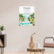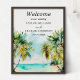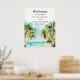 Ce panneau d'accueil mariage d'aquarelle élégant et magnifique dispose d'une plage, d'un ciel bleu et de palmiers. Le texte combine écriture manuscrite et polices sans serif pour un look élégant et moderne. Il est parfait pour une plage d'été ou un mariage de destination tropicale.