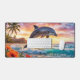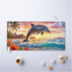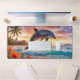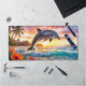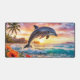 Desk mat featuring a fantasy painting of a dolphin on a tropical beach at sunset.