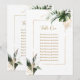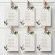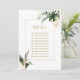 This wedding seating chart table card features watercolor green tropical foliage, palm tree leaves, banana leaves with gold script, and a gold rectangle frame. It's perfect for a beach or destination wedding.