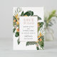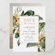 Foil pressé Mariage Enregistrer la Date pour une ambiance tropicale. L'établissement est doté de fleurs tropicales oranges et d'une végétation luxuriante. Inclure votre photo à l'arrière ou supprimer et laisser vide. Éditez avec votre libellé et choisissez parmi trois couleurs de feuille différentes, dont l'or, l'argent et l'or rose.