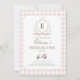 Admirez un premier anniversaire élégant avec cette invitation "Trou en un" rose, avec une charmant crête monogramme et un motif en vichy classique. Ce design sur le thème du golf est parfait pour la fête sportive et douce de votre petite fille.