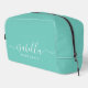 Ce sac d'accessoire Bridesmaid dopp kit contient une typographie manuscrite en écriture blanche avec des swashes sur un arrière - plan de minuit ou d'aqua. Présentez à vos demoiselles d'honneur un sac de toilette pour leur maquillage et des petits articles traditionnellement présentés au dîner de répétition, à utiliser tôt le matin avant le mariage.