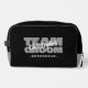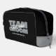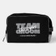 Le kit de toilette de mariage personnalisé pour vos garçons d'honneur présente "ÉQUIPE MARIÉ" en caractères gras gris clair sur un fond noir uni. Personnalisez le nom du garçon d'honneur en écriture blanche nette. Le titre ou le texte personnalisé est présenté ci-dessous. Toutes les couleurs de ce design sont personnalisables dans l'outil de conception Zazzle ! Envoyez un message pour les questions ou les demandes de couleurs personnalisées.