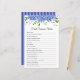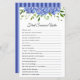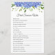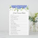 Cette feuille de jeu "Trouvez quelqu'un qui..." apportera beaucoup de plaisir et de rires à votre événement ! Elle fera se lever vos invités et se découvrir mutuellement alors qu'ils essaient de trouver quelqu'un qui correspond à chacune des catégories. Ce jeu n'est pas une tâche facile et vos invités s'amuseront beaucoup en y jouant ! Vous serez choqué par ce que vous apprendrez les uns des autres. La page est magnifique avec des hortensias bleus multicolores, de la verdure naturelle et un dos rayé bleu assorti.