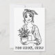 Carte de coloriage adulte mignonne pour un plante amoureux. Jolie dame tenant un plante avec une citation qui dit : "Tu grandies, fille !" Un joli jeu de mots plantes et une citation inspirante. Au dos un poème pour rappeler à votre ami de se détendre et de se détendre.