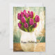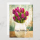 Beau bouquet de tulipes violettes de printemps rustique dans un pot rural blanc avec un arrière - plan en bois vintage. Un art de peinture à l'huile réaliste et magnifique. Belle façon de souhaiter un Joyeux Anniversaire ou de personnaliser en changeant ou en supprimant le texte pour s'adapter à votre propre occasion.
