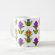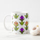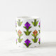 Cette tasse a un design art déco fait de diamants, triangles et polygones qui fabriquent des tulipes en orange et violet avec des tiges vertes et des feuilles.