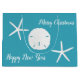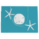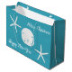Sacoche cadeau en papier bleu turquoise de Noël Tropical en grande taille. étoiles de mer et dollars de sable blanc décorent les deux côtés. Customisez l'accueil à deux endroits sur le devant. Exemple de libellé : "Joyeux Noël" et "Bonne année".