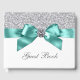 Turquoise livre d'hôtes bleu et argent avec joli ruban bleu turquoise et arc avec centre diamant sur un arrière - plan parties scintillant argent. Cet élégant livre d'hôtes bleu turquoise est facilement customisé pour votre événement en ajoutant simplement le texte de votre choix dans le style de police que vous préférez. Il s'agit d'un dessin imprimé sans parties scintillant, diamants, rubans, arcs, etc.