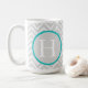 Savourez votre café ou votre thé avec une tasse à café Chevron Monogram Turquoise personnalisée. Le design de la tasse à café est doté d'un motif de chevron gris clair avec un emblème de cercle dessiné en turquoise. Autres articles disponibles avec cette conception aussi. Contactez-moi directement pour obtenir de l'aide sur la personnalisation.